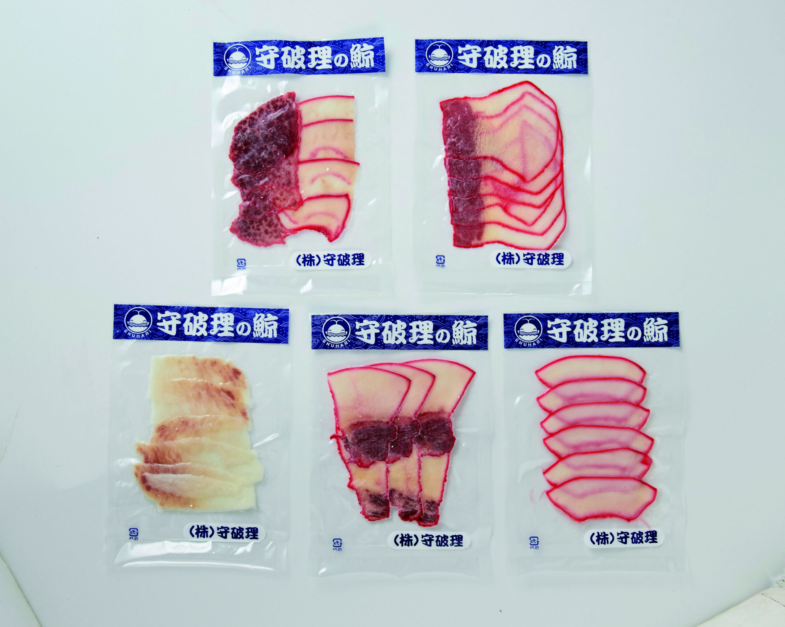 ヒゲ鯨ベーコンの人気部位を5種類、各100gずつ詰め合わせた贅沢な食べ比べセットです。